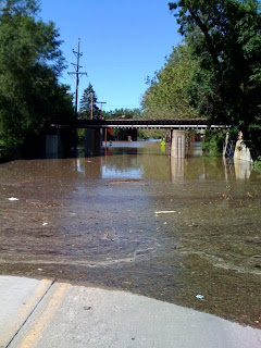 This photo is at the north west corner of the Iowa Avenue bridge. The bicycle path that goes under the bridge had been flooded. The bridge was closed to automobile traffic, but bicycles and pedestrians were crossing it just fine.
